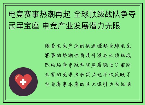从电竞赛事热潮的再起,到全球顶级战队的激烈争夺,电竞产业的发展无疑充满了无限的潜力和机会。随着技术的不断发展和赛事的日益成熟,电竞不仅仅成为了一个娱乐项目,更成为了全球文化的一部分。未来,电竞产业将继续拓展新领域,带来更多的商业价值和文化影响。